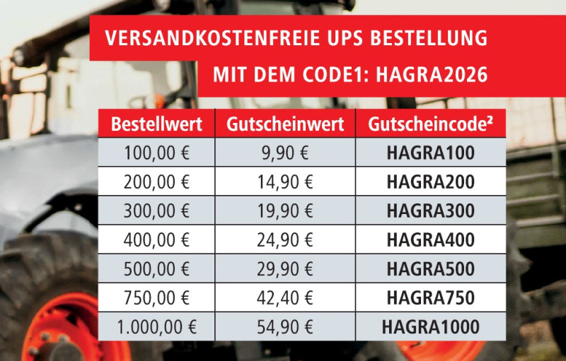 Als Dankeschön für Ihren Einkauf und Ihre Treue erhalten Sie als HAGRA-Kunde Wertgutscheine für unseren GRANIT-SHOP im Gesamtwert von 234,19 € (196,80 € netto). Diese Gutscheincodes können Sie bis 31.12.2026 einlösen.